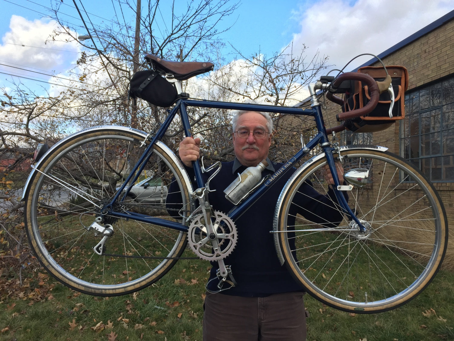 Many years later, in high school, I went to the local police auction in search of a new bike. I spied a tatty old bicycle covered in green house paint, but something about its lines stood out. I bought it for $26. Turned out it was a lightweight of indeterminate manufacture, with tubular tires, Campag Nuovo Record changers, Weinmann brakes and a Brooks leather saddle. I painted it silver, and it looked just like the Peloso in one of Mike Barry’s most recent Vintage Bicycle Features. It was the first bike I had ever seen, let alone ridden, with derailleur gears. What a marvel it was. I rode that bike all over Italy and England until I eventually sold it to a friend 20 years later.