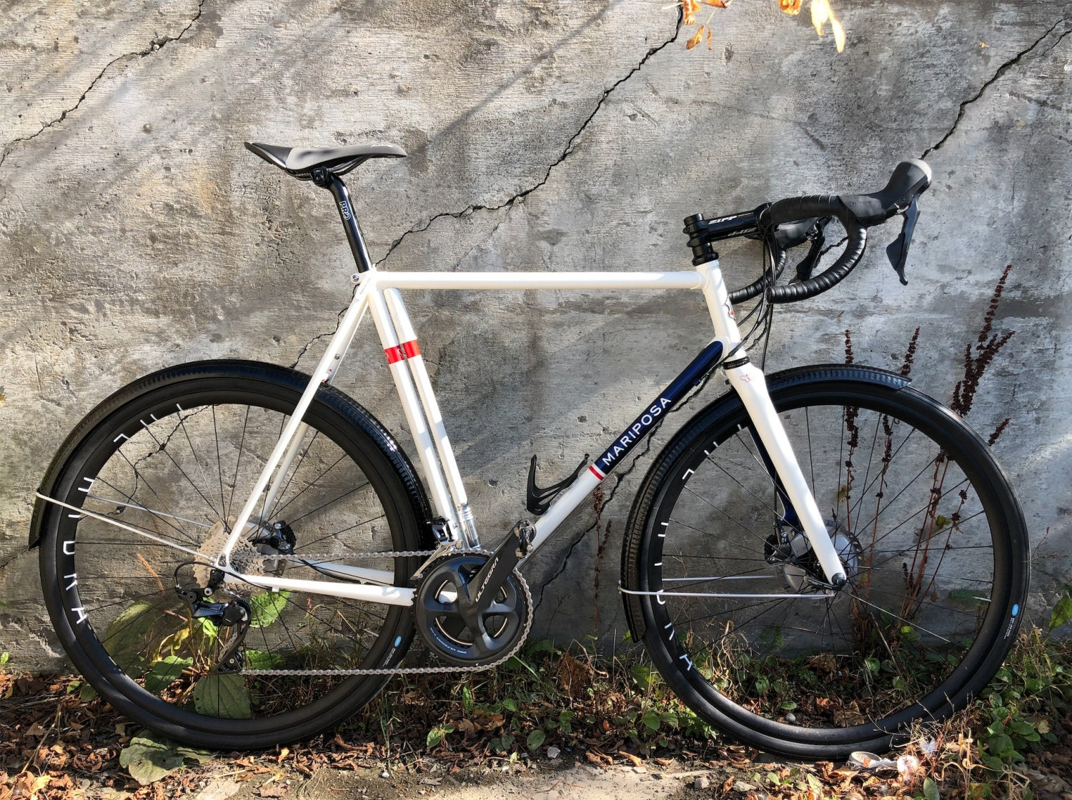 It was built with lightweight Columbus tubing with tire clearance for 700C x 42 or 650B x 48, a Whisky carbon fork that accepts fenders, removable Honjo Fenders and rear carrier bosses.