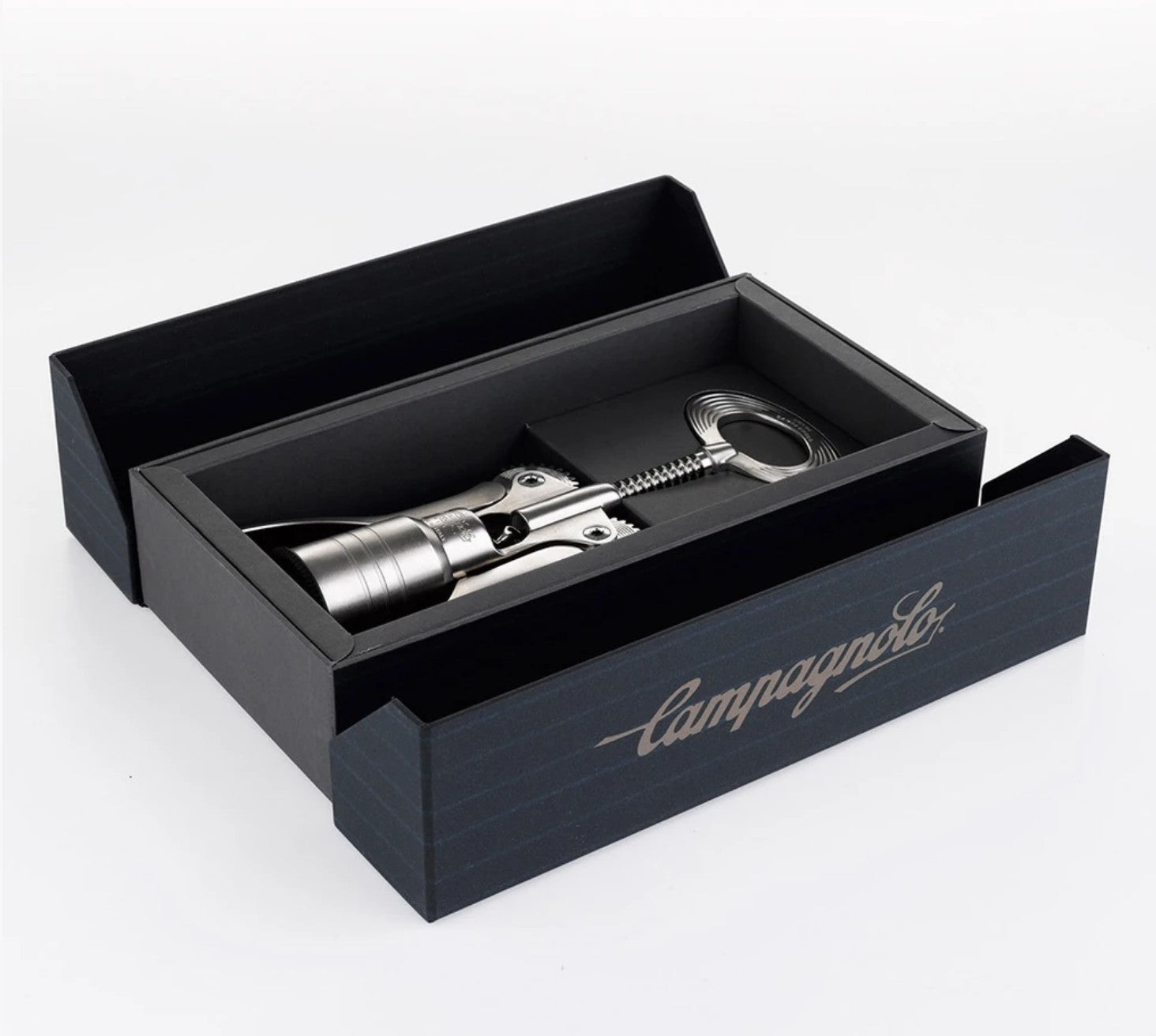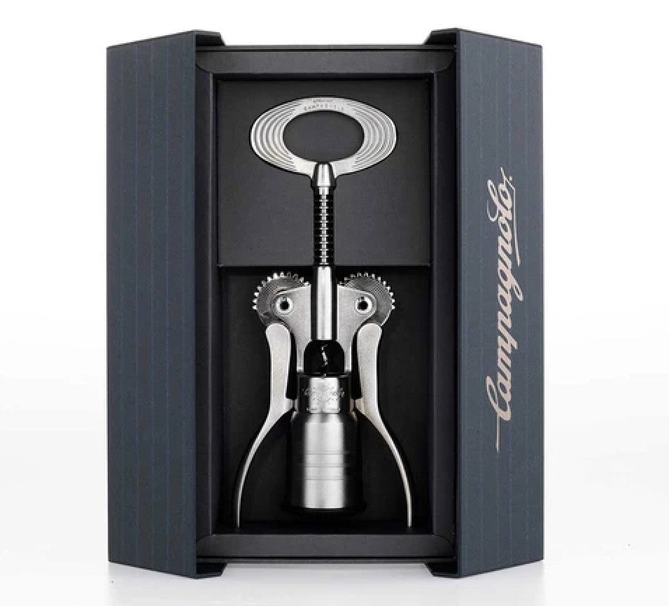 Pure Italian design with signature Campagnolo artisanship: the ultimate gift to any bike and / or wine afficionado "Rabbit ear" design, invented & patented by Tullio Campagnolo himself in 1966 Levers pivot on the same chainring bolts that were used on the 70's Super Record cranks Precise mechanism with self-centering bell that does not shake bottles, perfect for aged wines Designed to never pierce through the cork, thus preventing cork pieces from dropping in the wine Available in an antique-looking Bronze finish or a modern Satin silver finish Comes with its own collector's box 100% made in Italy