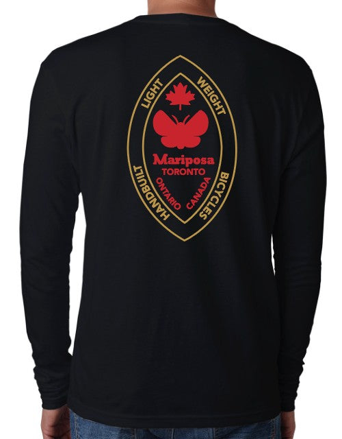 In celebration of our 50th Anniversary, we've made a long sleeve t-shirt with the original Mariposa headbadge logo, which Mike Barry Sr. sketched up for the first Mariposa frame that was raced on the track in Delhi Ontario. The logo was used until the mid-80's when it was refined by a graphic designer. It was updated again five years ago.